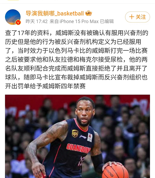 接下来,我们再来说说威姆斯这边的情况,因为威姆斯本赛季大有返老还童的表现,威姆斯的表现和他此前在山西男篮的表现是天差地别。知名的篮球媒体人“导演我在哪”在社交媒体上连续发声。篮球媒体人“导演我在哪”先是表示:此前目送在以色列马卡比的时候被要求和两名队友接受尿检,他的两名队友配合了并且完成了尿检。而威姆斯直接拒绝并且离开了球队,随后马卡比宣布裁掉威姆斯,而反兴奋剂组织也对于威姆斯进行了4年的禁赛。而在4年,威姆斯也是来到了FIBA体系之外的CBA打球。