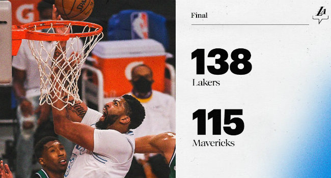 360直播12月26日讯 卫冕冠军湖人今日坐镇主场迎来独行侠的挑战,两支纸面实力出色的球队在各自的揭幕战双双输球未能取得开门红。上半场湖人开局攻势稳定取得领先后一路压制对手,次节开局下起三分雨接连命中4记三分,湖人用一波15-5的攻势拉开比分并带着12分的领先进入下半场。下半场的湖人一直稳守领先,独行侠仅在第四节初将分差追至9分制造了一丝威胁,但湖人很快重新拉开比分并一路保持两位数领先。最终,湖人轻取独行侠迎来新赛季首胜,独行侠则遭遇两连败。