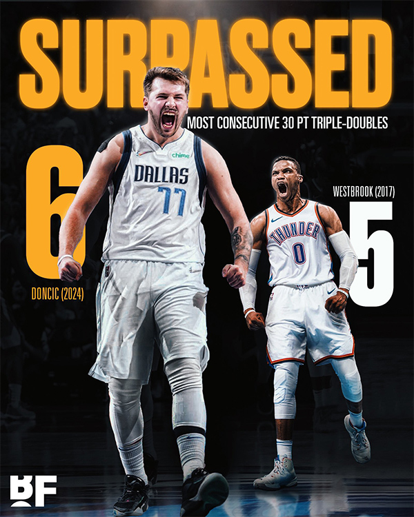 1、东契奇连续6场30+三双,超越威少和大O罗伯特森,创造新的连续30+三双历史纪录