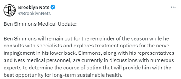篮网官宣本-西蒙斯将缺席本赛季剩余的比赛,他将咨询专家并探索下背部神经紧张的治疗方案;西蒙斯和他的经纪人以及篮网队医正在与多位专家进行讨论,以确定为他提供长期可持续健康的最佳治疗方案。