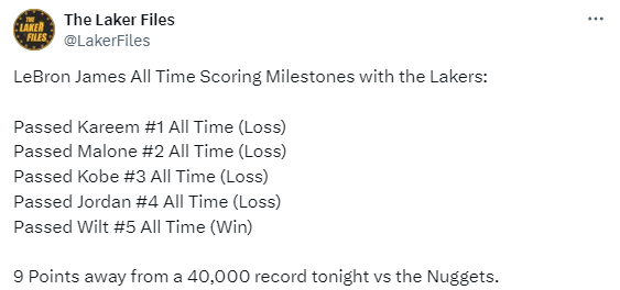 NBA晒出詹姆斯距离40000分仅仅只差9分的海报,晒出詹姆斯的生涯高光时刻,还发推列出詹姆斯超越众名宿加冕历史得分王的情况——2018年11月15日,詹姆斯总得分超越张伯伦升到历史第5位;2019年3月7日,詹姆斯超越乔丹升到历史第4位;2020年1月16日,詹姆斯超越科比升到历史第3位;2022年3月20日,詹姆斯超越卡尔-马龙升到历史第2位;2023年2月8日,詹姆斯超越贾巴尔成为NBA历史得分王。