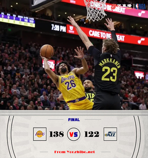 360直播讯:北京时间02月15日NBA常规赛,湖人背靠背挑战爵士,全场比赛结束,湖人138-122拿下爵士。