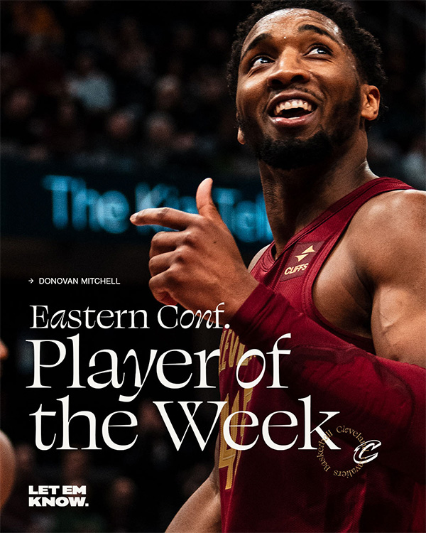 米切尔赛季首次当选东部周最佳,生涯第6次当选,骑士生涯第3次当选周最佳,仅次于欧文(骑士时期4次)和詹姆斯(骑士时期42次)排在队史第三多。