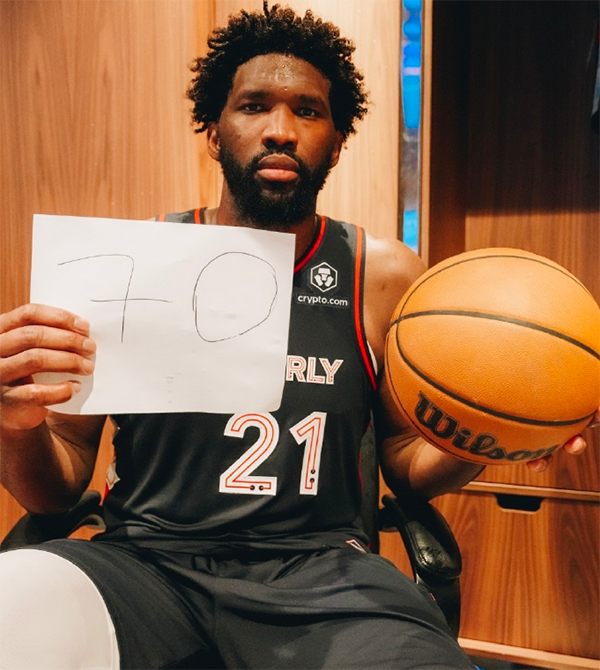 76人主场击败马刺,恩比德打出超神一战,全场41投24中、罚球23中21狂砍70分18篮板5助攻,超越张伯伦成为76人队史单场得分王,成为现役第4位70分先生,NBA历史上第9位70分先生,更是成为史上第一位单场至少70分15篮板5助攻的球员。