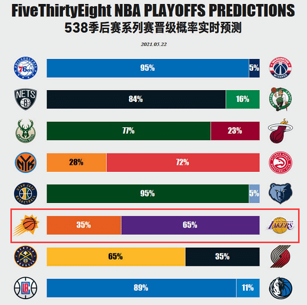 同时湖人晋级的概率已经跌至49%,这是根据数据网站FiveThirtyEight第一时间更新了双方的晋级概率。湖人跌至49%,太阳升至51%;值得一提的是在系列赛开始前,外媒的预测湖人晋级概率高达65%;