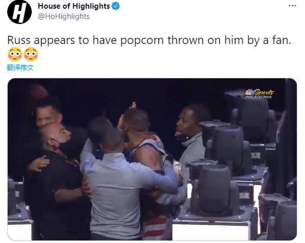 360直播讯 北京时间5月27日,奇才和东部第一系列赛G2,场上多次出现受伤事件,末节威少脚踝受伤,一瘸一拐返回更衣室,离场时在球员通道入口处,威少被现场球迷激怒,情绪失控一副要揍人的样子,几个大汉才拦住他。