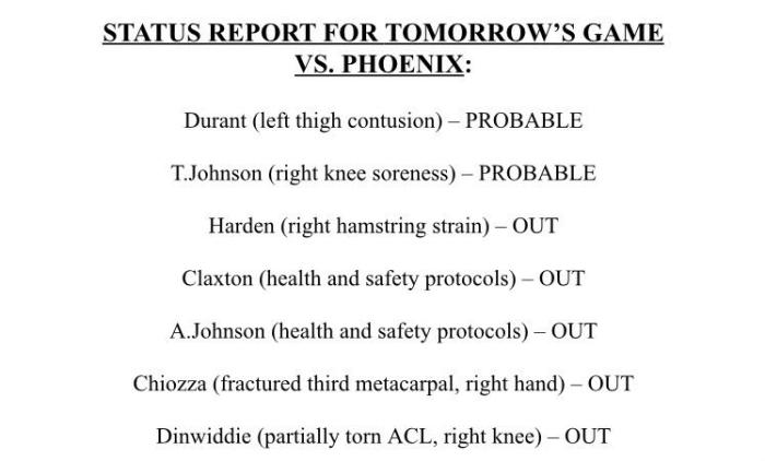 360直播讯 布鲁克林篮网正式官宣下一场对阵太阳的伤病报告,哈登(右腿筋拉伤)、齐奥萨(右手骨折)、丁威迪(右膝伤势)以及克拉克斯顿和A-约翰逊五名球员继续缺席比赛,杜兰特(左大腿挫伤)和泰勒-约翰逊(右膝酸痛)出战状态再次升级,都被列为大概率出战。