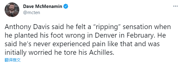 回顾当初受伤的第一感受,浓眉表示二月份在丹佛受伤时,他感到一种“撕裂”的声音。他说自己从未经历过那样的痛疼,最初担心他会撕毁自己的跟腱。