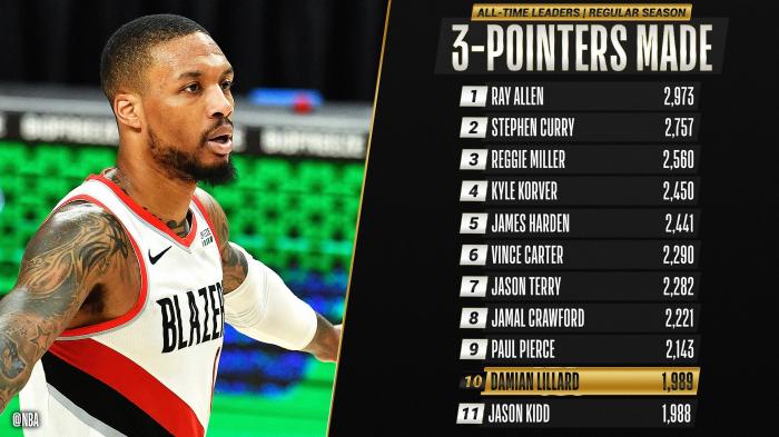 360直播讯北京时间4月22日,开拓者和掘金比赛中,利拉德伤愈复出,复出首战的进攻状态不错,首节早早命中三分球,因此利拉德破纪录,常规赛三分命中数达到1989记,正式超越名宿贾森-基德(湖人助教),升到NBA历史三分榜第10位。
