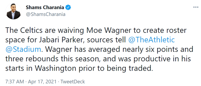 一波五连胜过后,凯尔特人已经升至东部第五,胜率和第四的老鹰持平。为了给帕克腾出一个阵容名额,凯尔特人裁掉了瓦格纳。赛季至今,瓦格纳场均5.6分2.7篮板,在被交易到凯尔特人前,他在奇才的表现不错。