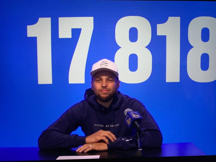 库里疯狂一战点燃全美,众美媒以及名记纷纷狂吹库里;赛后库里坐在专属背景墙前面接受采访,17818代表了库里目前的勇士生涯总得分,库里扭头几次看这个分数,勇士名宿克里斯-穆林现身,与库里连线并且恭喜后者成为勇士队史得分王。