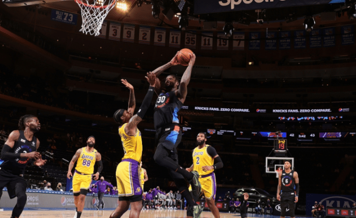 360直播4月13日讯 今天NBA常规赛结束了一场焦点战,湖人客场96-111不敌尼克斯吃到败仗。这场比赛詹姆斯和浓眉哥依旧缺席,庄神德拉蒙德拿下3分10板1断1帽的数据,整体的表现相对一般,而且在比赛中他的篮下防守不到位,失误也偏多。