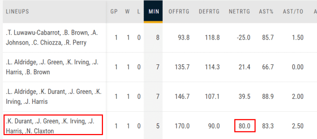 在这场比赛中,篮网一共有4套阵容至少使用5分钟。其中,最猛的就是上述这套5人组,他们的进攻效率是170.0,防守效率是90.0,百回合赢80分!这是4套阵容里进攻效率最好,防守效率也最高的5人组。杜兰特、欧文、哈里斯都能在进攻上给对方带来巨大的威胁,而21岁的小将克拉克斯顿则能给防守端注入活力。
