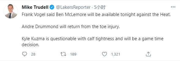 詹姆斯多次晒合影暗示即将复出,不过他们都将缺席湖人和热火的比赛,但庄神可以出战,新援麦克勒莫也有望迎来湖人首秀,库兹马因小腿伤势将在赛前决定是否出战。