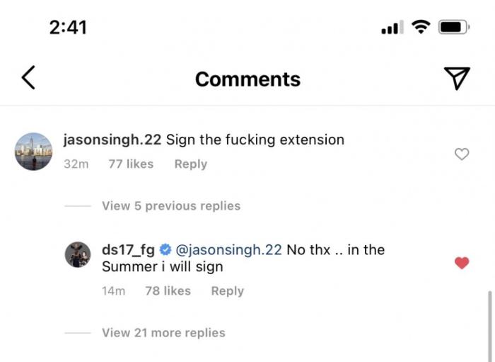21分大胜国王后,施罗德很开心附文“永远对你的所作所为感到开心。”随后有网友在下方评论说到:“你赶紧TMD把约续了。”施罗德回复说到:“不了谢谢,等到了休赛期我会签的。”他的回复也直接表明了自己的态度,证明自己并非是嫌弃湖人的续约合同太小了,而是希望等到休赛期再做出决定!