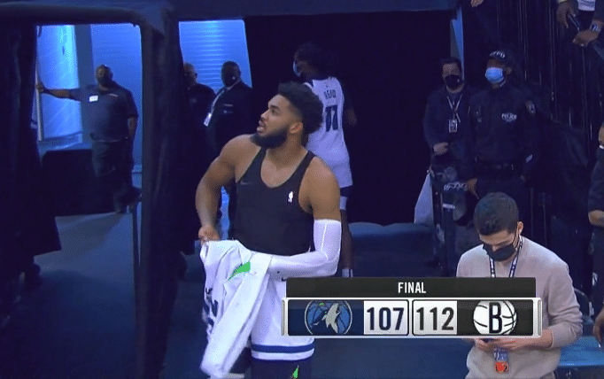 比赛末段麦克丹尼尔斯三分不中,哈登抢到篮板达成三双数据,唐斯三分命中,关键时刻哈连续失误,布朗失误,麦克丹尼尔斯、爱德华兹篮下连续得分,森林狼将分差缩小到了1分,欧文三分不中,爱德华兹抛投没有,16.7秒篮网落后1分,关键时刻哈登两罚全中,比斯利强投三分不中,欧文两罚全中,比赛失去悬念,最终全场比赛结束,篮网112:107战胜森林狼。本场比赛哈登38分13助攻11篮板 ,三双数队史第一。欧文27分7板3助攻,格里芬5分6板5助攻,正负值13分队第一。