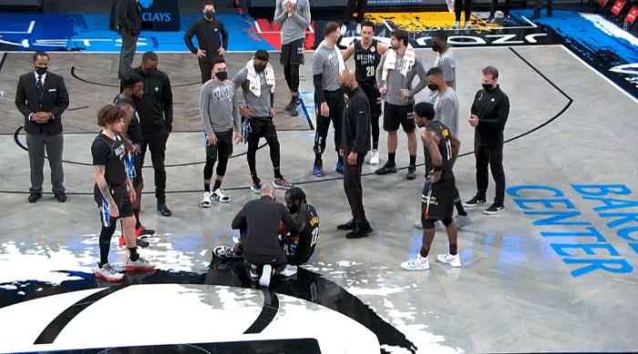 上半场快结束时,哈登和奇才球员马修斯争抢球权,结果哈登被马修斯撞到头部,当时哈登表情痛苦,捂着嘴巴坐在地板上,放弃最后一攻;半场结束后,篮网队医过来检查哈登的伤势,欧文等队友也围过来,哈登左右以及上下摇摆自己的脖子,表情显得有些晕,然后慢慢地走回更衣室。