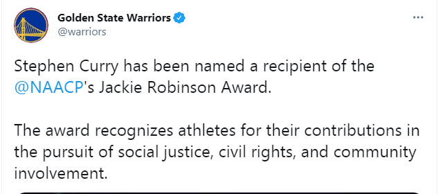 1998年,乔丹获得过杰基-罗宾森体育奖;2017年,詹姆斯也被授予这一奖项。库里比肩乔丹詹姆斯,成为第三位获得这一奖项的NBA球员。