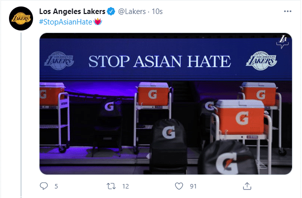 360直播3月19日讯 ,NBA常规赛湖人主场迎战黄蜂。在这场比赛之前,湖人官推晒出了一张照片。照片内容显示,在湖人主场斯台普斯中心,场边标语写着“停止仇视亚裔”。湖人官方也用这样的行动,对于亚裔枪击案中受伤害的人们进行了声援。