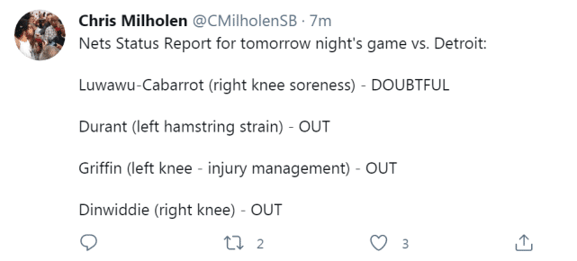 360直播讯北京时间3月13日,篮网官方公布了最新的伤病名单,杜兰特(左腿筋拉伤)、格里芬(左膝伤病管理)、丁威迪(右膝伤病)继续缺阵,卢瓦乌-卡巴罗特(右膝酸痛)大概率不打。篮网的下一个对手是底特律活塞,这意味着格里芬将无缘对阵老东家。