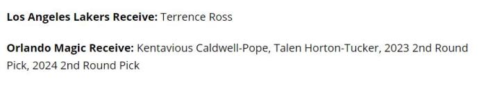 据美媒《FW》的报道,湖人需要送出波普、小塔克、2023年次轮选秀权和2024 年次轮选秀权,才能从魔术换来罗斯。