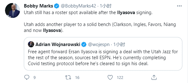 360直播3月10日讯 据名记shams报道联盟第一的爵士将会签约艾森-伊利亚索瓦,双方将签约到赛季结束,目前伊利亚索瓦正在接受新冠检测,然后双方便可以正式签约;按照这节奏,爵士真要变成联盟第一三分大队,又补强外线太疯狂了。