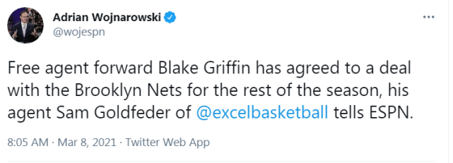 美媒报道称,格里芬很可能在篮网体系中打替补,扮演小球阵容的中锋。格里芬的到来,也让篮网的冲冠前景更被看好。