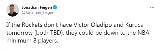 《休斯顿纪事报》记者费根表示,如果明天火箭依然等不到奥拉迪波和库鲁茨,他们可以出场的球员人数有可能会下降到联盟最低要求的8人。此前对马刺一战,火箭只有9名球员可以上场,如果考辛斯也不能打了,主帅赛拉斯的排兵布阵将更加捉襟见肘。