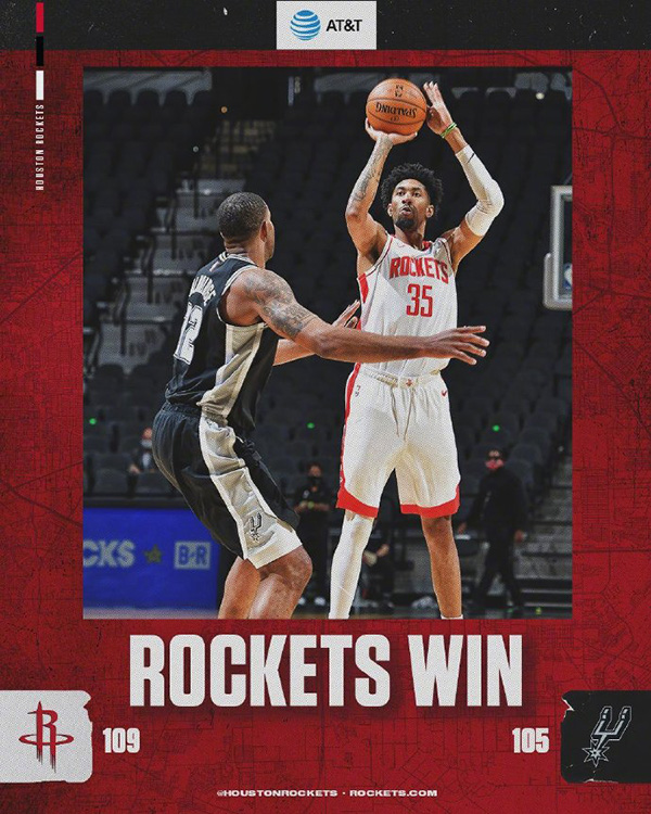360直播讯:北京时间1月15日,2020-21赛季NBA常规赛继续进行,休斯顿火箭客场挑战圣安东尼奥马刺。全场打完,火箭109-105逆转马刺,止住两连败。
