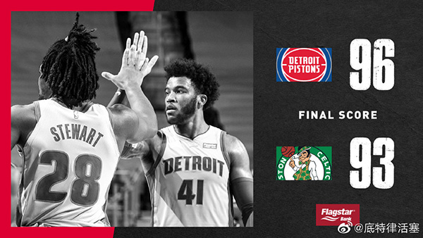 末节,布朗发威连得7分,一己之力打出7-0,凯尔特人以80-79反超。斯图尔特两罚中一,此后完成暴扣2+1,活塞83-80再度领先。米哈伊柳克三分命中。终场前7分15秒,活塞86-83领先。塔图姆两度投中三分,凯尔特人93-88领先。格兰特连投带罚,罗斯反击上篮,帮助活塞以94-93反超。终场前25秒,萨迪克-贝两罚中一,活塞95-94领先。终场前5.6秒,普拉姆利两罚中一,活塞96-93领先。凯尔特人连续进攻不中,最终活塞以96-93险胜凯尔特人,获赛季首胜。