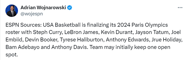 360直播讯 北京时间4月16日,据名记Woj报道,美国男篮即将出炉2024年巴黎奥运的参赛球员名单,目前已经敲定11人,他们分别是:库里、詹姆斯、杜兰特、塔图姆、恩比德、布克、哈利伯顿、爱德华兹、霍乐迪、阿德巴约和浓眉,球队可能会暂时空缺一个名额。至于谁能赶上末班车,目前还不确定。
