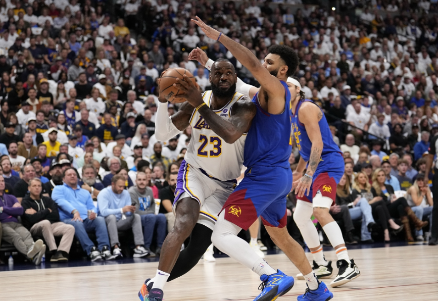 比赛正式开打,詹姆斯早早开启得分模式,背打穆雷转身上篮,外线命中三分球,底线空切冲击篮筐,外线再中三分,老詹开场4中4独砍10分;之后詹姆斯开始传球组织进攻,湖人一直占上风,第一节35秒,詹姆斯在反击中冲击篮筐,被雷吉凶狠搂抱犯规并且失衡摔倒,老詹两罚全中,湖人首节33-25领先掘金8分。