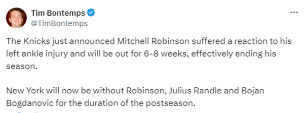 360直播讯 北京时间5月8日,纽约尼克斯官方宣布,米切尔-罗宾逊遭遇左脚踝应力性损伤,他将在6-8周后接受复查,如果按6周来算,米切罗复出时间则是6月19号,这意味着米罗因伤提前赛季报销。