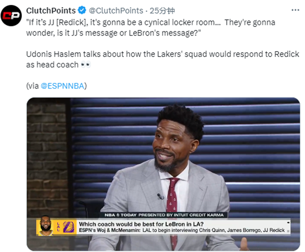 雷迪克领跑争夺湖人新帅,前热火球员哈斯勒姆担忧雷迪克担任湖人新帅会搞乱更衣室,哈队在节目中表示:“如果雷迪克确定为湖人主帅,更衣室内将充满怀疑和怨恨的情绪,一些人会说,‘教练会在赛后和勒布朗一起做播客吗?’,你的更衣室里会有一群愤世嫉俗的家伙,他们会盯着JJ说的每一句话,因为他们想知道,这是JJ的意思还是勒布朗的意思?