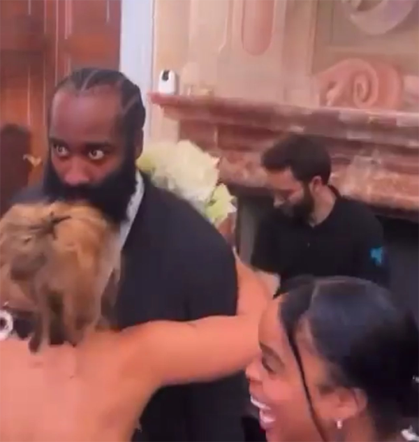 在一场婚礼上,新娘抛出象征美好寓意的手捧花,一轮争抢后,最终哈登女友抢到手捧花(这意味着她是下一个要结婚的人),现场的宾客和美女集体起哄大笑,而哈登瞪大双眼十分震惊,女友赶紧拥抱安慰他。