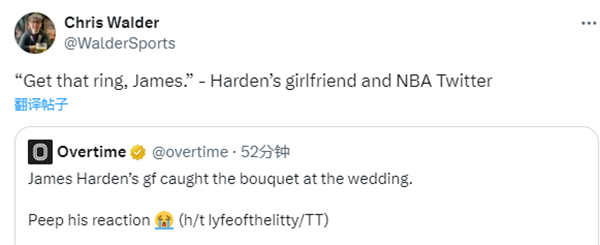 哈登在婚礼上目瞪口呆一幕引热议,美球迷调侃哈登终于要得到一枚戒指(婚戒)了;哈登在杜兰特之前找到女朋友;还有球迷表示哈登不想要这枚戒指,他想要申请交易女友,更有球迷调侃哈登和女友因不明原因分手,他们肯定会分手的。
