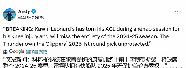 而在9月234日,名记ANDY爆料,突发新闻,伦纳德在膝盖受伤的康复训练中前十字韧带撕裂,将缺席整个24-25赛季,雷霆队拥有快船队的2025年无保护的首轮选秀权。