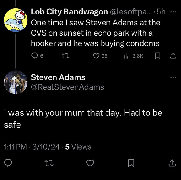 亚当斯新家的房间里只有一张西蒙斯,球迷调侃这也太寒酸了;亚当斯的动态引热议,一位名为Lob City Bandwagon的球迷评论表示:有一次我在回声公园日落大道的CVS看到史蒂文-亚当斯,他与一位特殊行业从业者在一起,正在购买安全用品。