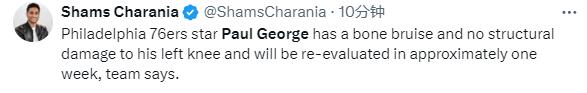 360直播讯北京时间10月16日,76人球星保罗-乔治的膝伤核磁检查结果出炉,据名记shams报道,费城 76 人队表示,保罗-乔治左膝骨挫伤,没有结构性损伤,将在大约一周后重新接受评估。