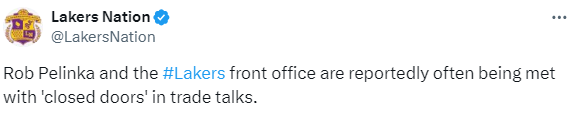 360直播讯北京时间11月15日,目前湖人7胜4负排在西部第6位,但由于球队内线又遭打击,湖人管理层开始行动了,据报道,湖人想要补强前场,但湖人在交易谈判时频繁吃到闭门羹。