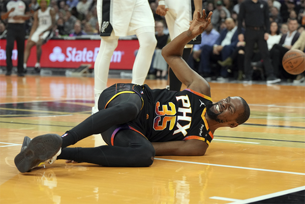 360直播讯北京时间12月4日,NBA杯太阳主场对阵马刺,杜兰特又伤了,左脚踝90度扭伤,下半场没有首发而且第三节一直留在更衣室治疗脚踝,之后确定退出本场比赛。