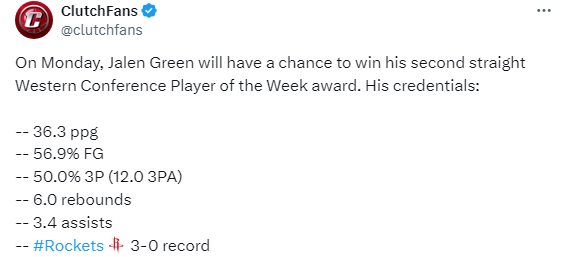 本周三场比赛,杰伦-格林场均拿到36.3分6篮板3.4助攻,投篮命中率56.9%和三分命中率50%,有望连续两周夺得西部周最佳,还有望凭借出色的表现夺得西部3月月最佳球员。