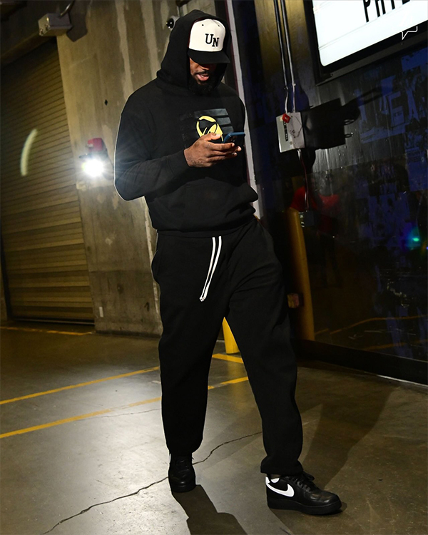 湖人官方晒出詹姆斯的入场照和热身照——詹姆斯身穿一套黑色运动服,搭配一双黑色板鞋,戴着棒球帽入场,低头刷着手机走进球馆;在更衣室中换上训练服,在健身房中卖力拉练,之后老詹将前往球场上进行一系列的投篮训练,提前到场积极备战76人。
