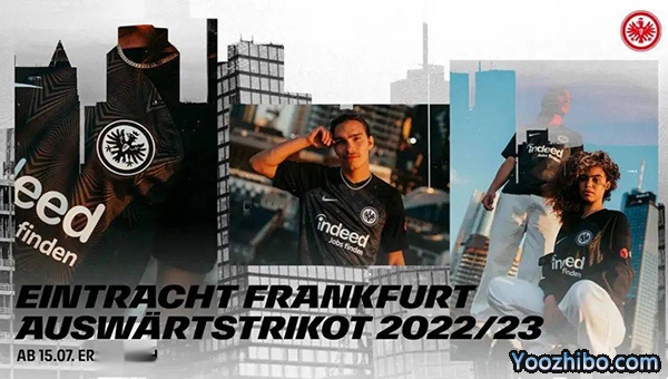 2022-23赛季法兰克福客场球衣搭配黑色球裤与球袜。球衣使用100%由回收塑料瓶制成的再生聚酯纤维面料制造。