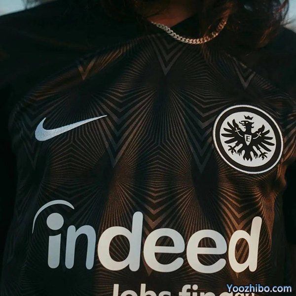 2022-23赛季法兰克福客场球衣采用黑色与无烟煤色的低调色彩组合,球衣正面带有以醒目的无烟煤色呈现的欧普艺术设计图案。衣领、肩膀以及衣袖则以黑色示人。队徽、Nike Swoosh以及球衣广告则以色彩反差强烈的白色示人。