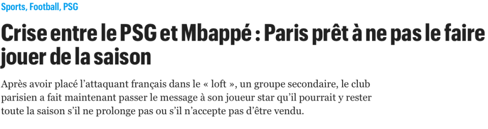360直播讯07月23日,来自法国知名媒体《巴黎人报》的最新消息,巴黎管理层已于本周告知姆巴佩,如果他不同意续约,或是不同意今夏离队,本赛季他将无法身披巴黎球衣参加任何1场比赛。