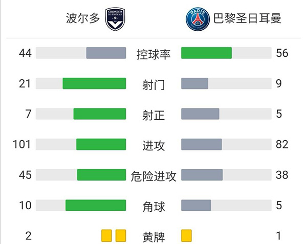 全场比赛结束,巴黎圣日耳曼3-2波尔多。