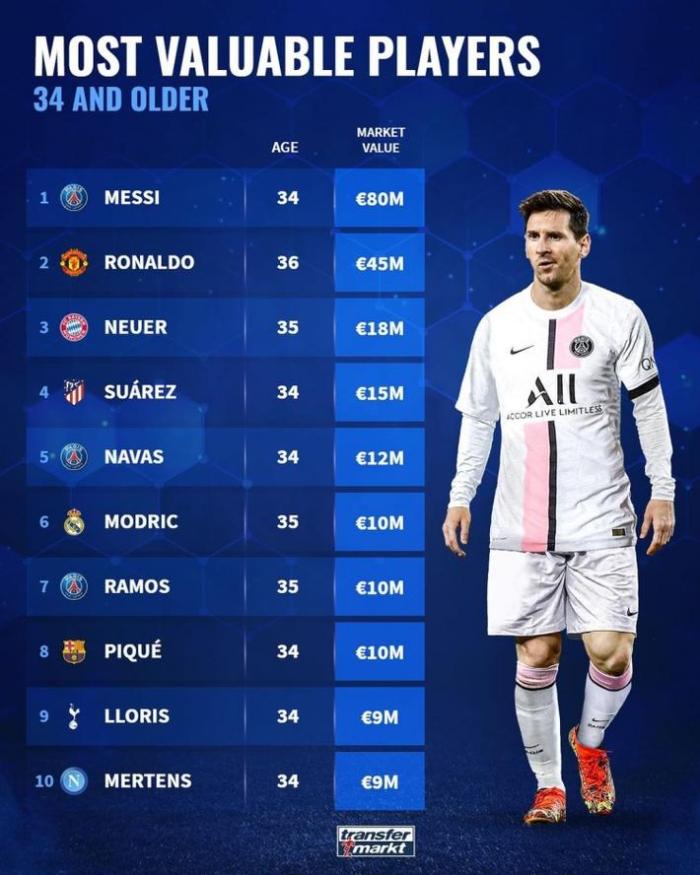 360直播9月05日讯 今日,德转更新了世界足坛34岁及以上球员的身价榜单,其中梅西8000万欧居首,C罗4500万欧位列次席。