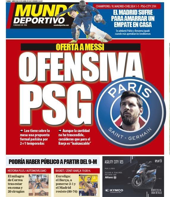 360直播讯 今日,《世界体育报》在自己的头版中透露,巴黎圣日耳曼给梅西开出报价,但是对于巴萨来说无法匹配。