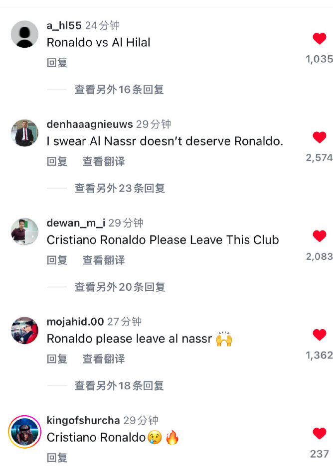 C罗粉丝气愤写道:“堪称耻辱的决赛,这场比赛就是C罗一个人VS利雅得新月!”:“我发誓利雅得胜利根本配不上拥有C罗!”:“C罗快点离开这样的俱乐部吧,否则未来永远不可能再拿冠军!”:“为史上最佳感到惋惜和遗憾!”:“看到C罗在球场上那么孤立无援,真的很无奈。”